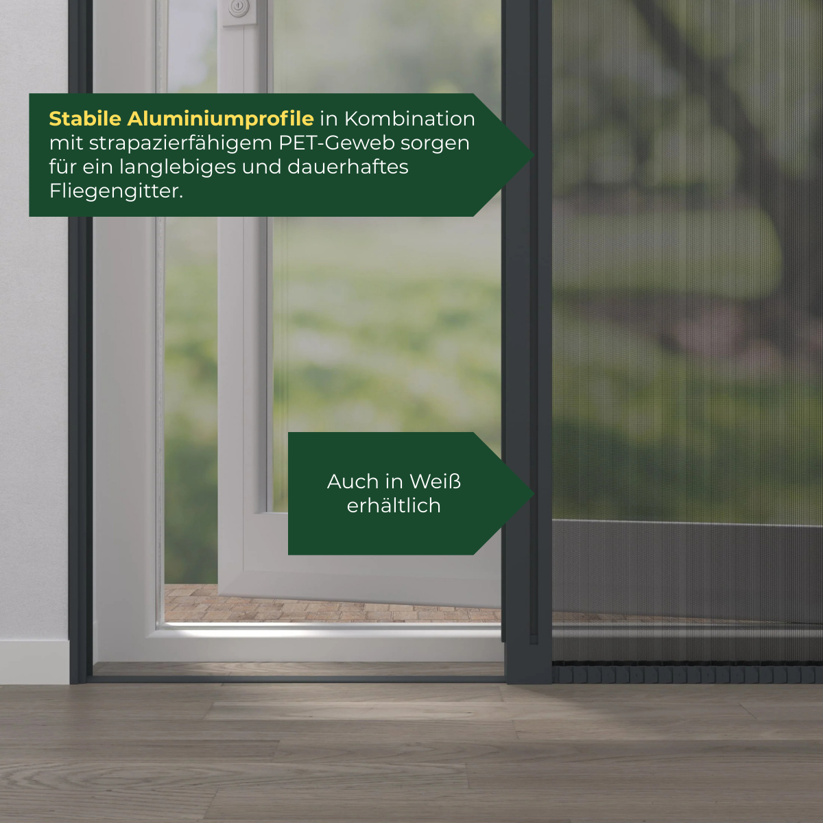 Für nach innen und außen öffnende Türen, Edle Optik durch plissiertes Gewebe und Kassettenprofil und Befestigung durch Bohren