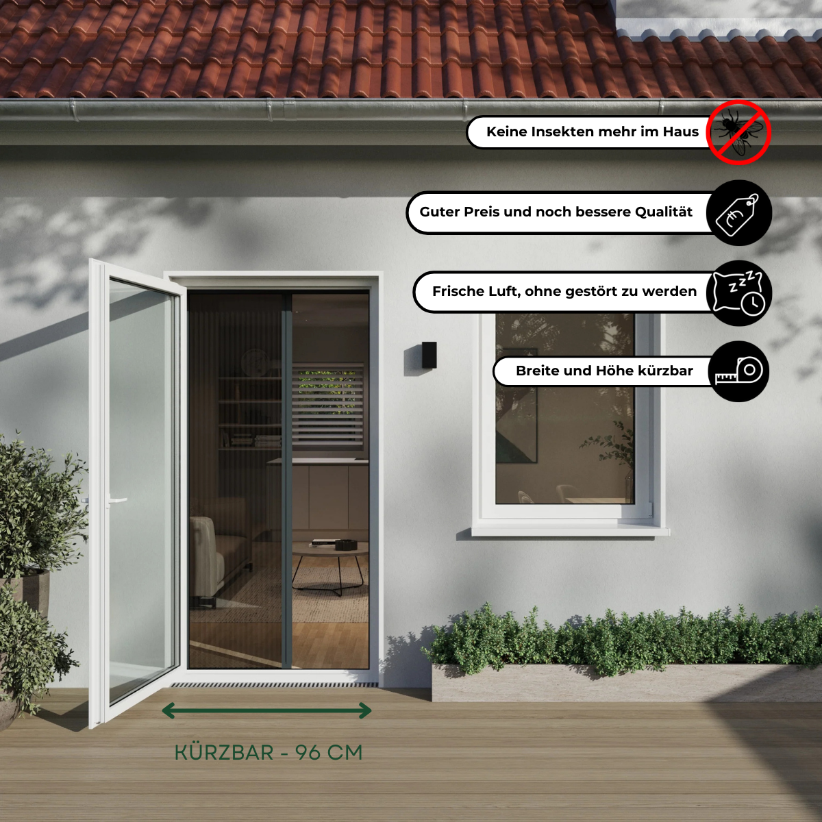 Von nun an können Sie Ihre Türen den ganzen Sommer über offen lassen und die frische Luft hereinlassen, ohne Probleme mit Mücken, Wespen oder Insekten. Dieses Plissee muss nicht aufwendig gekürzt werden, sondern kann so verwendet werden, wie es ist. Lediglich die horizontalen Profile werden gekürzt, um sie an die Öffnung Ihrer Tür anzupassen. Das Plissee lässt sich von der Seite öffnen und wird in einer stilvollen Kassette verstaut.