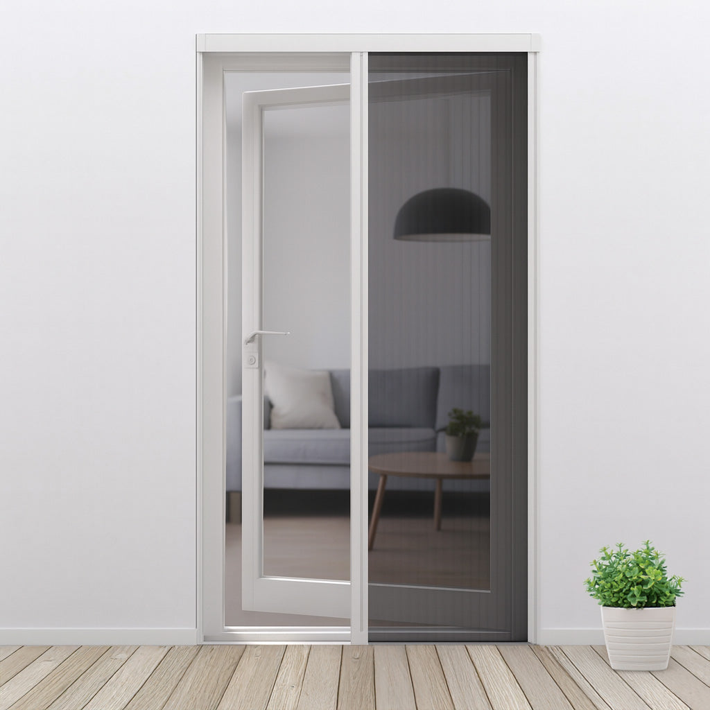 Normalerweise findet man diese Art von Tür nur bei Maßanfertigungen. Diese Plissee-Kassette ist für jede Tür geeignet, deren Öffnung maximal 3 cm größer ist als die Produkthöhe. Die untere Schiene lässt sich zusammen mit dem Insektenschutz öffnen und schließen, was die Benutzung sehr einfach macht.