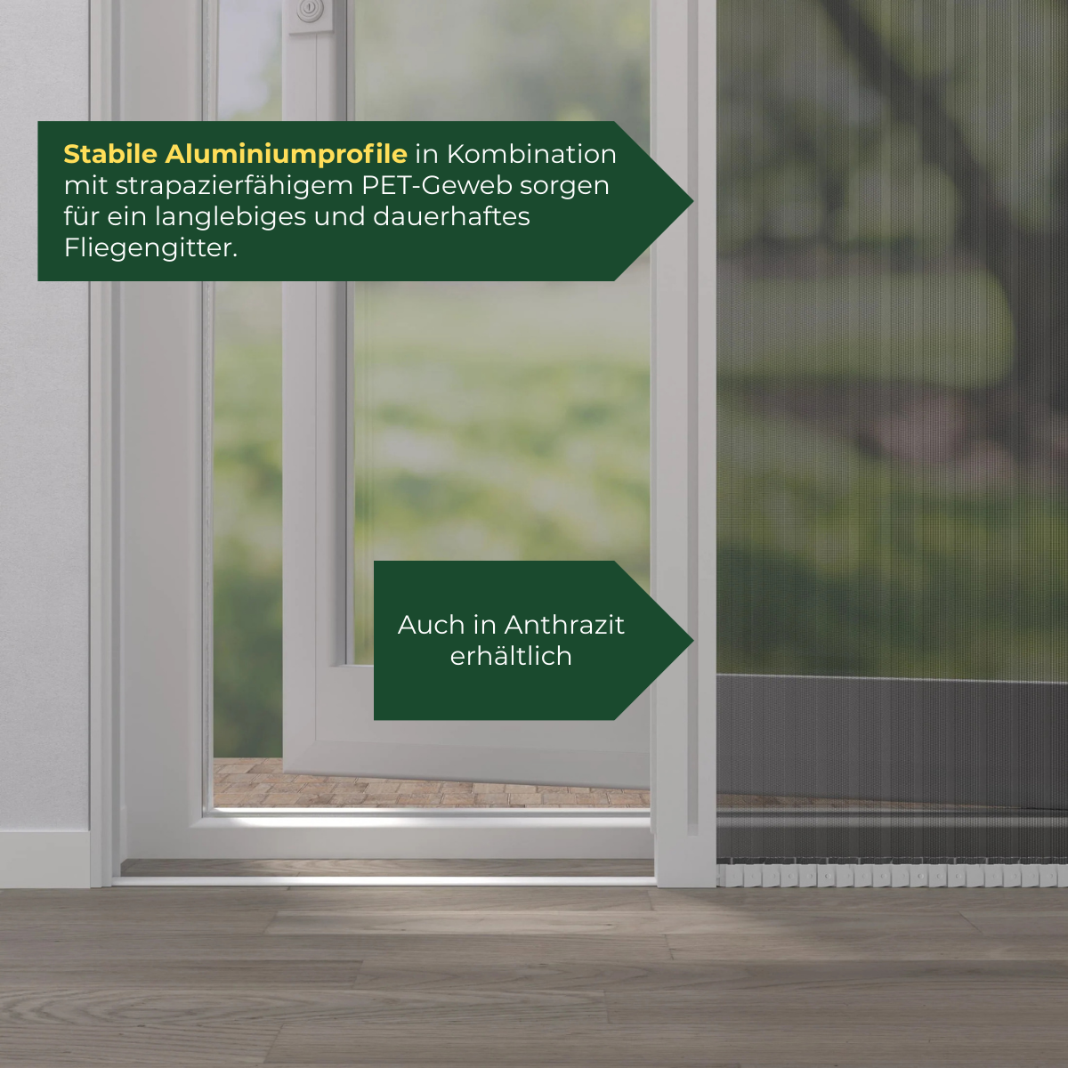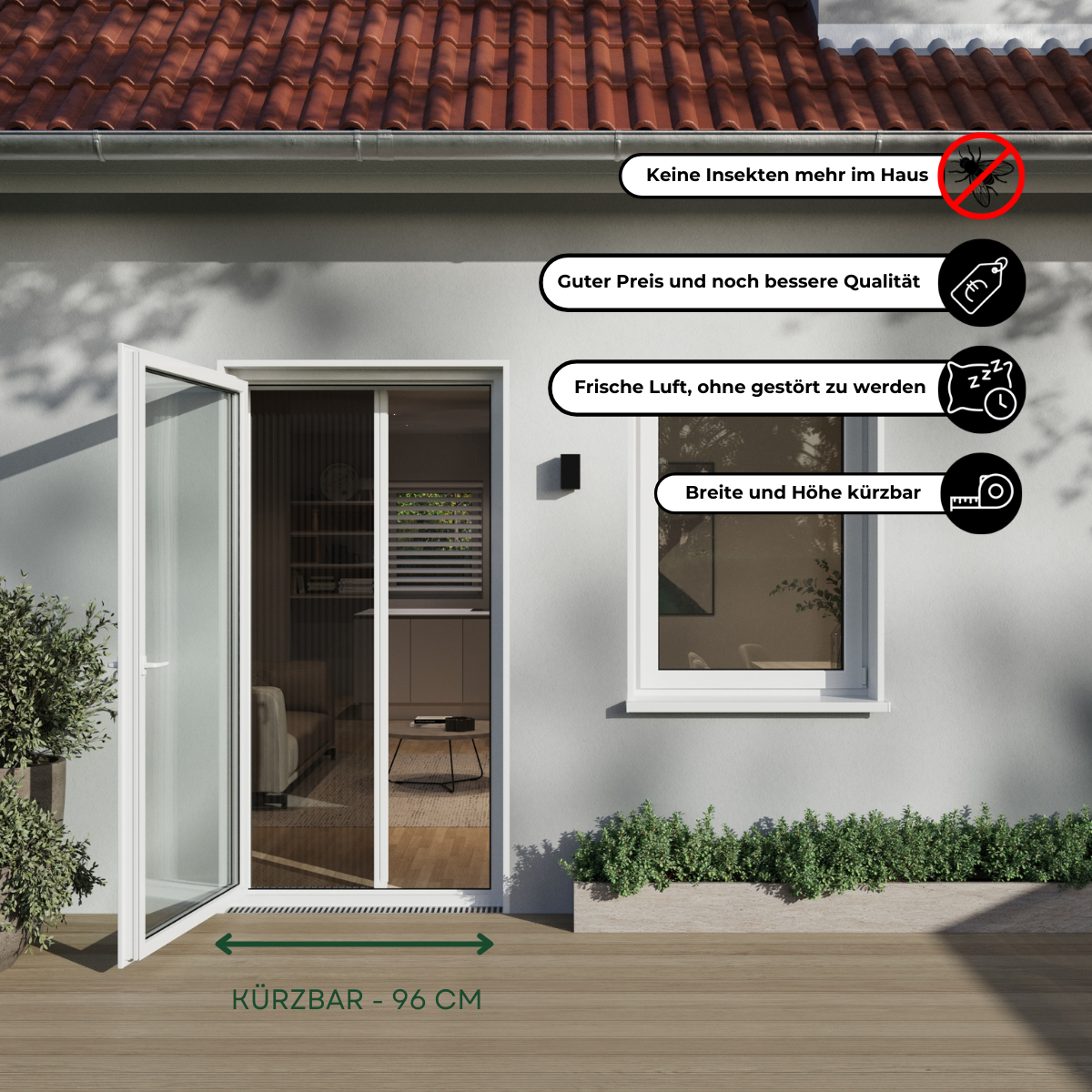 Von nun an können Sie Ihre Türen den ganzen Sommer über offen lassen und die frische Luft hereinlassen, ohne Probleme mit Mücken, Wespen oder Insekten. Dieses Plissee muss nicht aufwendig gekürzt werden, sondern kann so verwendet werden, wie es ist. Lediglich die horizontalen Profile werden gekürzt, um sie an die Öffnung Ihrer Tür anzupassen. Das Plissee lässt sich von der Seite öffnen und wird in einer stilvollen Kassette verstaut.